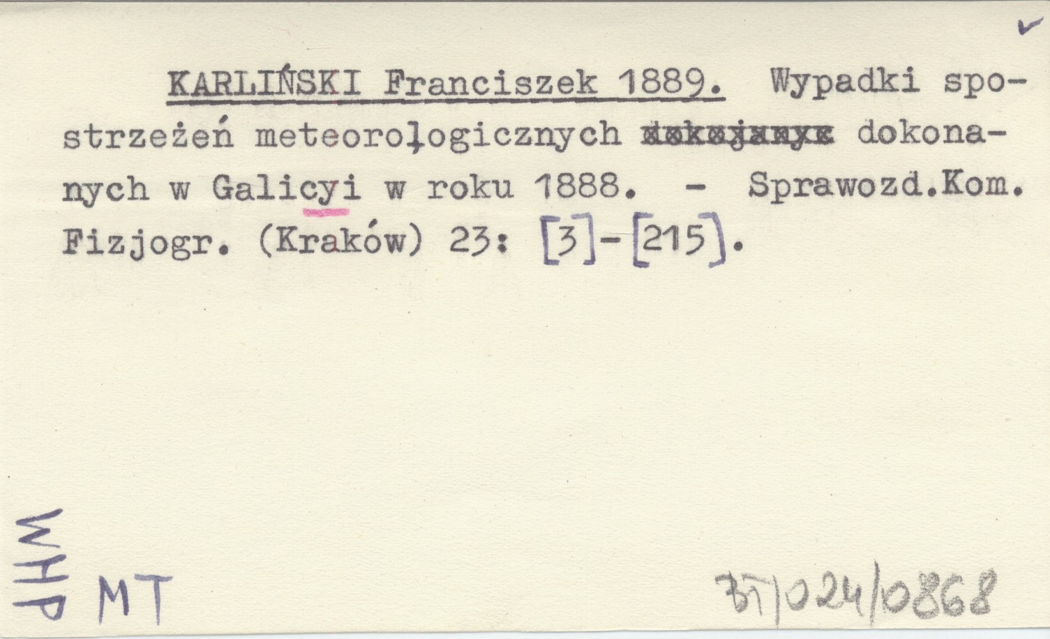 KARLIŃSKI Franciszek 1889 Wypadki spostrzeżeń meteorologicznych dokonanych w Galicyi w roku 1888.
