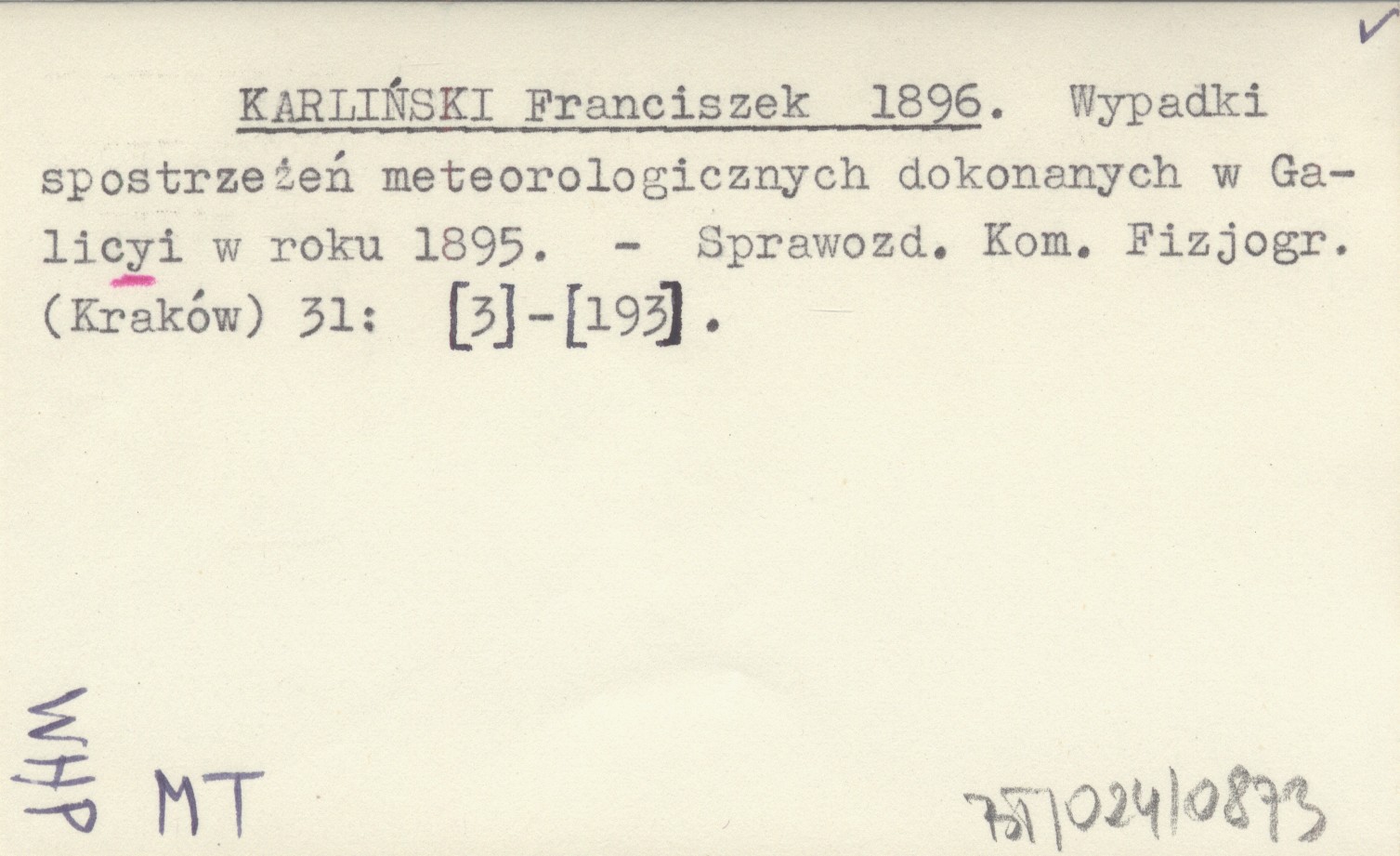 KARLIŃSKI Franciszek 1896 Wypadki spostrzeżeń meteorologicznych dokonanych w Galicyi w roku 1895.