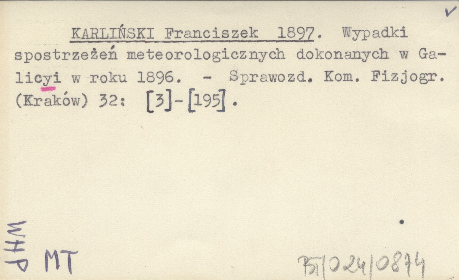 KARLIŃSKI Franciszek 1897 Wypadki spostrzeżeń meteorologicznych dokonanych w Galicyi w roku 1896.