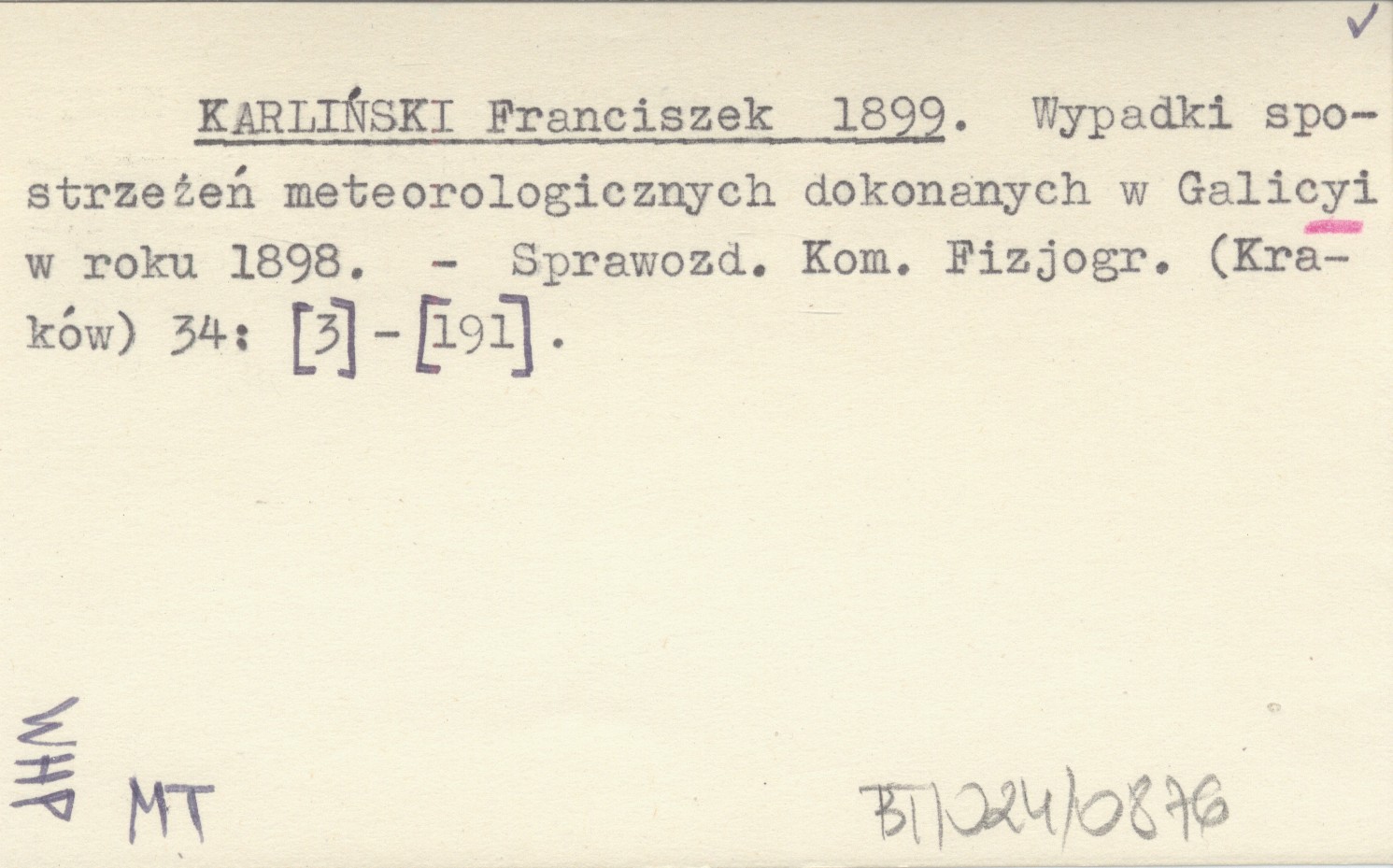 KARLIŃSKI Franciszek 1899 Wypadki spostrzeżeń meteorologicznych dokonanych w Galicyi w roku 1898.