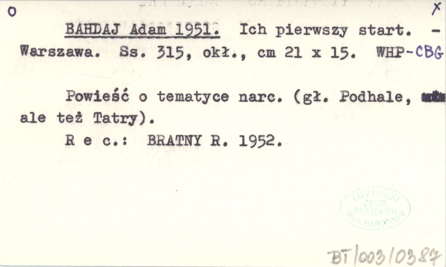Warszawa , 315 s., okł., 21x15 cm. Powieść o tematyce narc. (gł. Podhale, ale też Tatry). REC: BRATNY R. 1952