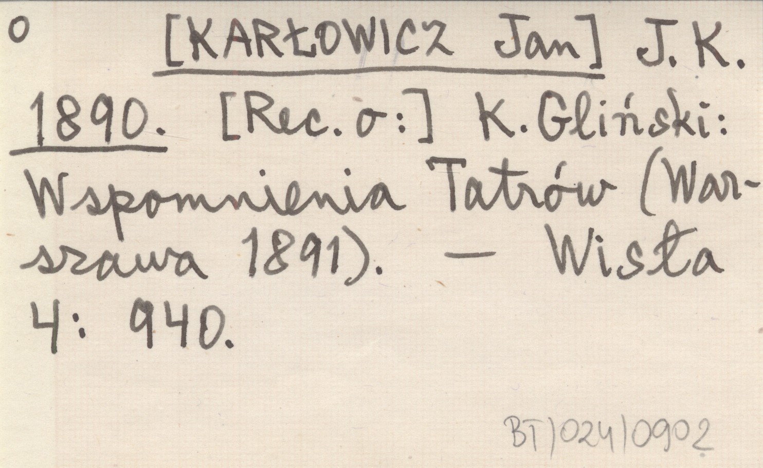 J. K. [KARŁOWICZ Jan] 1890 K. Glińśki: Wspomnienia Tatrów (Warszawa 1891).