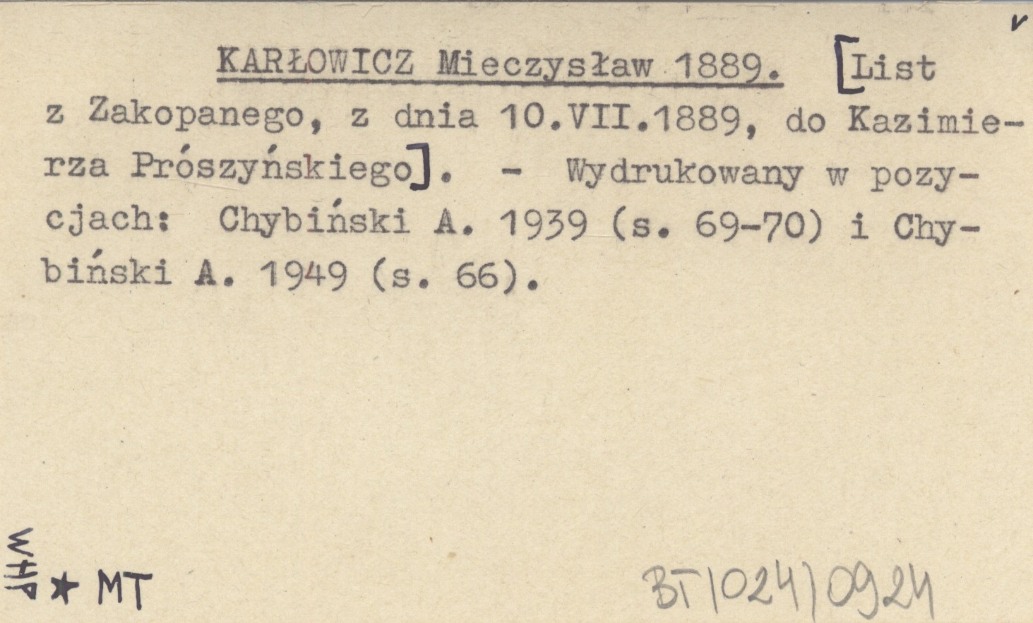 KARŁOWICZ Mieczysław 1889 [List z Zakopanego, z dnia 10.VII.1889, do Kazimierza Prószyńskiego].