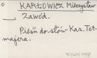 KARŁOWICZ Mieczysław Sześć pieśni na jeden głos z towarzyszeniem fortepianu. 1. Zasmuconej. Słowa K. Gliński, 2. Skąd pierwsze gwiazdy. Słowa J. Słowacki, 3. Na śniegu. Słowa M. Konopnicka, 4. Zawód. Słowa K. Tetmajer, 5. Pamiętam ciche, jasne, złote dnie... Słowa K. Tetmajer, 6. Smutną jest dusza moja... Słowa K. Tetmajer.