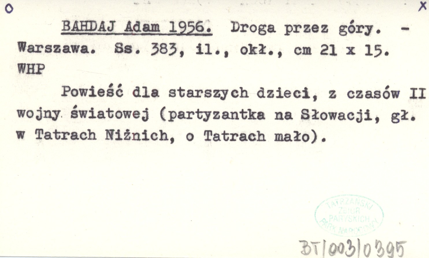 Warszawa , 393 s., il., okł., 21x15 cm. Powieść dla starszych dzieci, z czasów II wojny światowej (partyzantka na Słowacji, gł. w Tatrach Niżnich, o Tatrach mało).