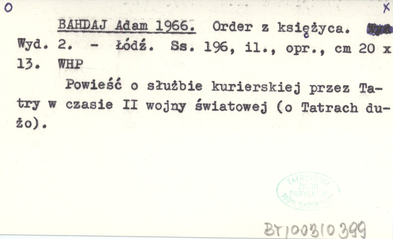 WYD: 2 Łódź , 196 s., il., opr., 20x13 cm. Powieść o służbie kurierskiej przez Tatry w czasie II wojny światowej (o Tatrach dużo).