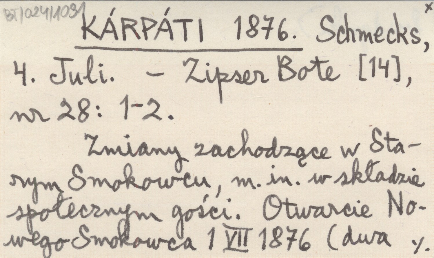 Zipser Bote, [14], nr 28: 1-2. Zmiany zachodzące w Starym Smokowcu, m. in. w składzie społecznym gości. Otwarcie Nowego Smokowca 1 VII 1876 (dwa budynki).