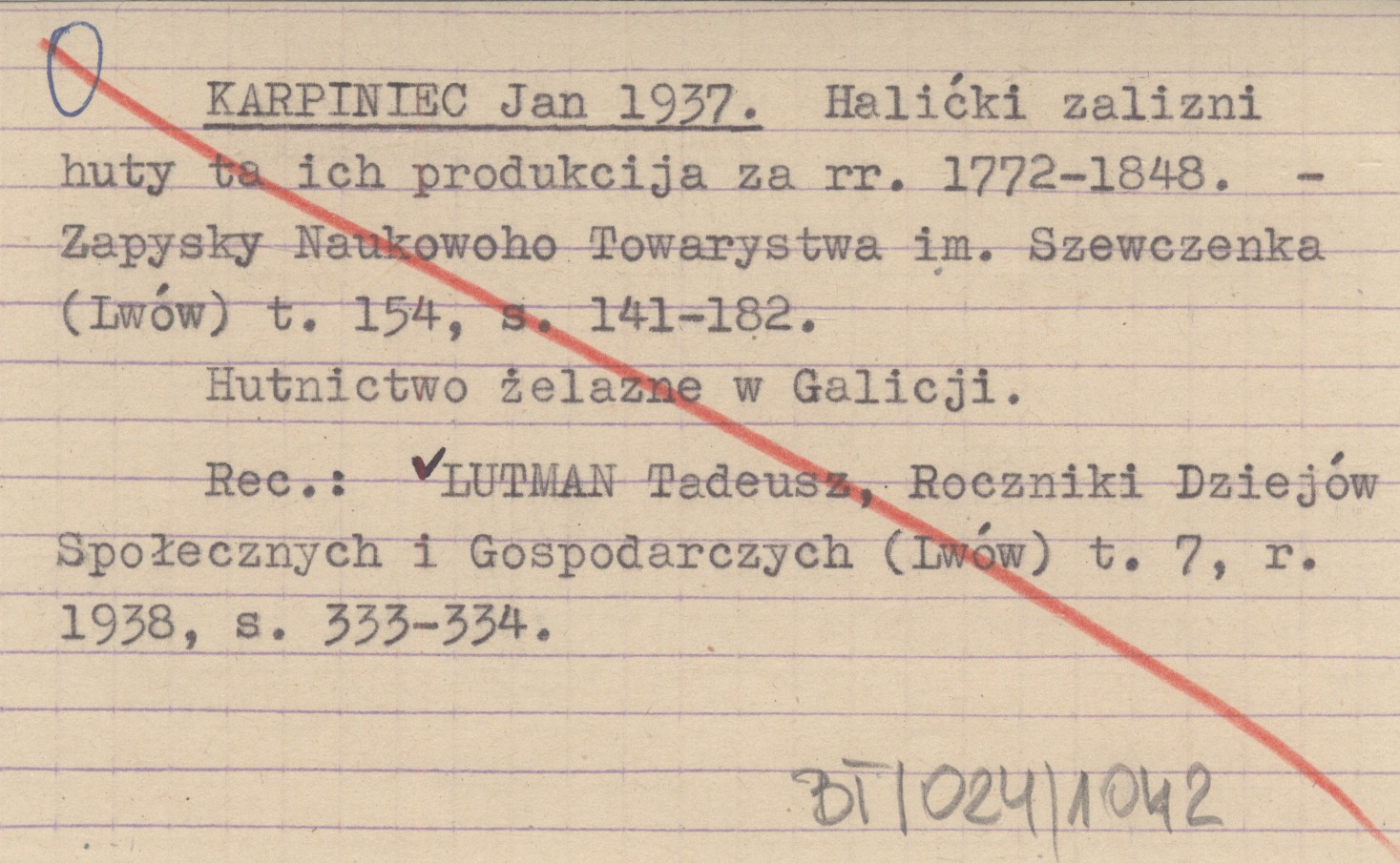 Zapysky Naukowoho Towarystwa im. Szewczenka (Lwów) , T. 154: 141-182. Hutnictwo żelazne w Galicji. REC: LUTMAN Tadeusz, Roczniki Dziejów Społecznych u Gospodarczych (Lwów) t. 7, r. 1938: 333-334.