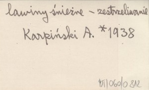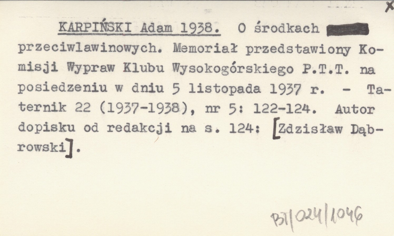 KARPIŃSKI Adam 1938 O środkach przeciwlawinowych. Memoriał przedstawiony Komisji Wypraw Klubu Wysokogórskiego P.T.T. na posiedzeniu w dniu 5 listopada 1937 r.