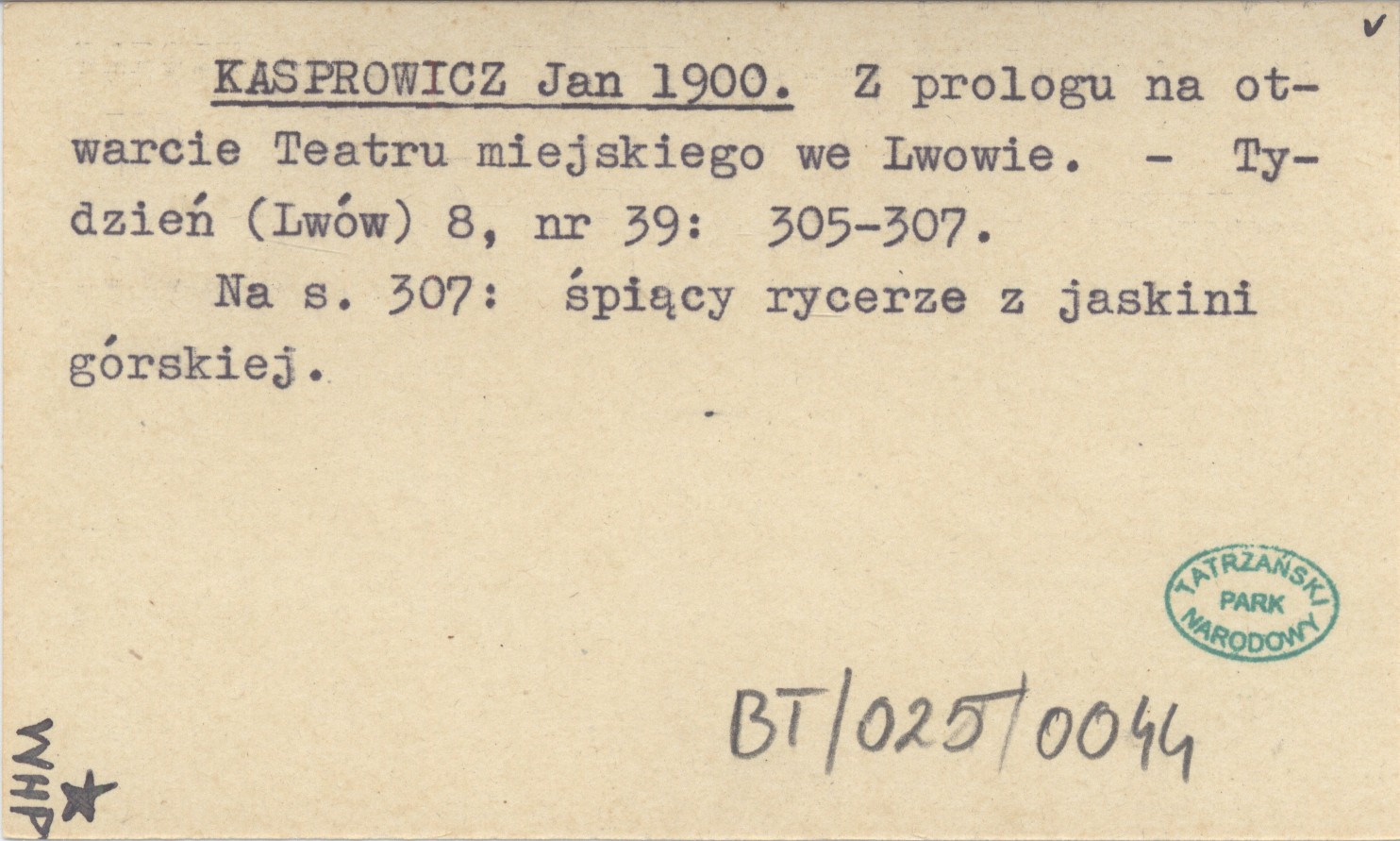 KASPROWICZ Jan 1900 Z prologu na otwarcie Teatru miejskiego we Lwowie.