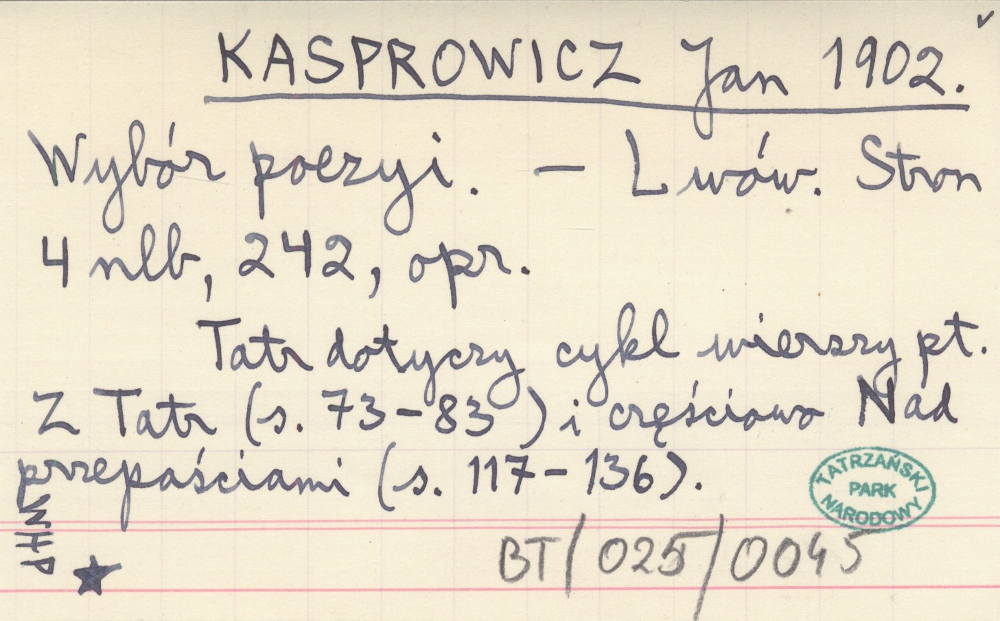 Lwów , [4], 242 s., opr. Tatr dotyczy cykl wierszy pt. Z Tatr (s. 73-83) i częściowo Nad przepaściami (s. 117-136).