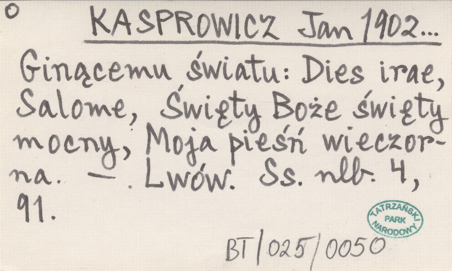 KASPROWICZ Jan 1902... Ginącemu światu: Dies irae, Salome, Świty Boże święty mocny, Moja pieśń wieczorna.