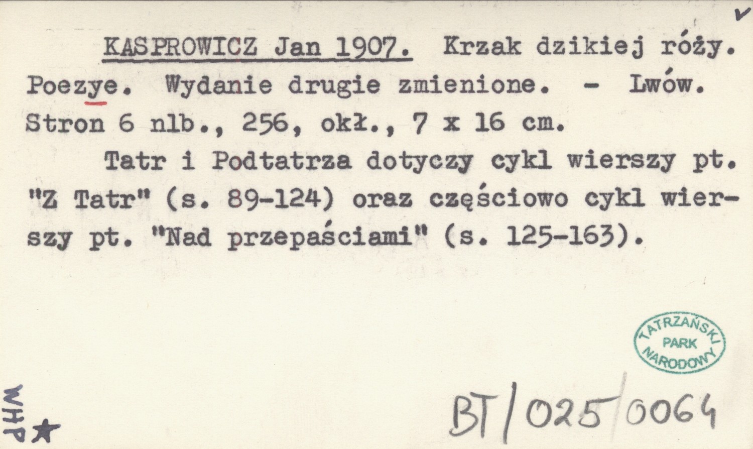 WYD: 2 zm. Lwów , [6], 256 s. okł., 7x16 cm. Tatr i Podtatrza dotyczy cykl wierszy pt. "Z Tatr" (s. 89-124) oraz częściowo cykl wierszy pt. "Nad przepaściami" (s. 125-163).