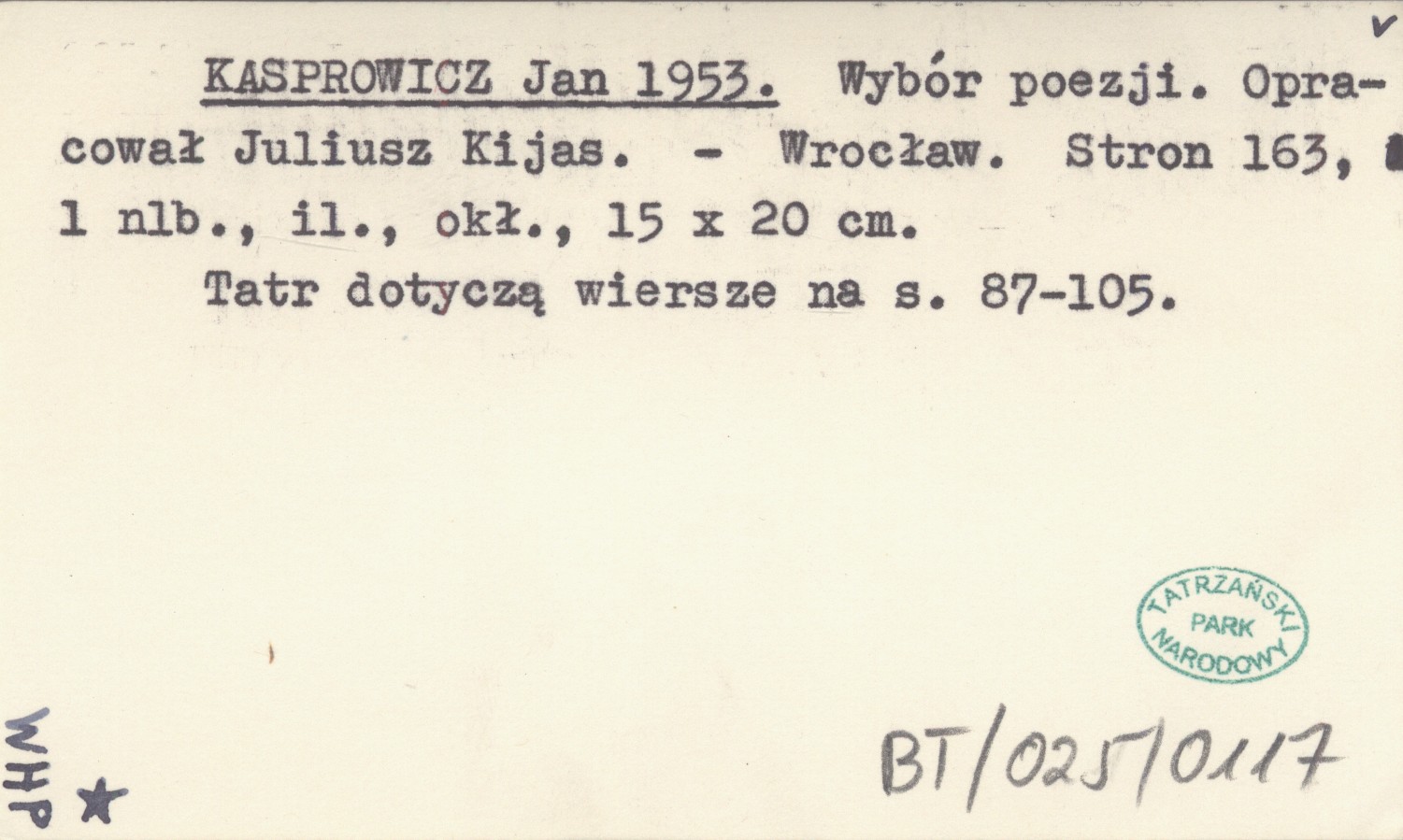 KASPROWICZ Jan 1953 Wybór poezji. Opracował Juliusz Kijas.