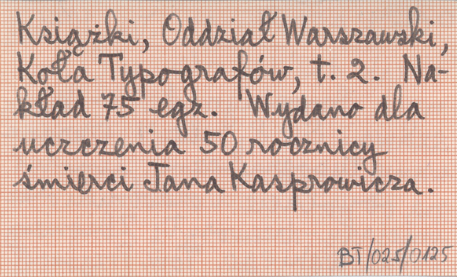 Warszawa (Towarzystwo Przyjaciół Książki, Oddział Warszawski, Koła Typografów ; 2) , 8, [4] s. Wydano dla uczczenia 50 rocznicy śmierci Jana Kasprowicza. Opracowanie topograficzne, linoryt na obwolucie i ozdobniki oraz inicjały - drzeworyty Zbigniewa Dolatowskiego. Nakład 75 egz.