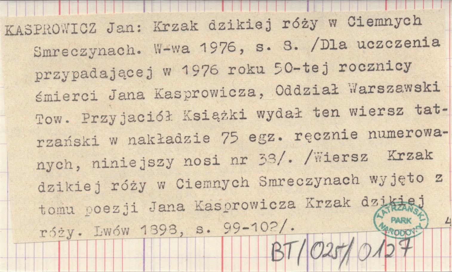 Warszawa , S. 8. Dla uczczenia przypadającej w 1976 roku 50-tej rocznicy śmierci Jana Kasprowicza, Oddział Warszawski Towarzystwa Przyjaciół Książki wydał ten wiersz tatrzański w nakładzie 75 egzemplarzy ręcznie numerowanych, niniejszy nosi nr 38. Wiersz Krzak dzikiej róży w Ciemnych Smreczynach wyjęto z tomu poezji Jana Kasprowicza Krzak dzikiej róży. Lwów 1898: 99-102.