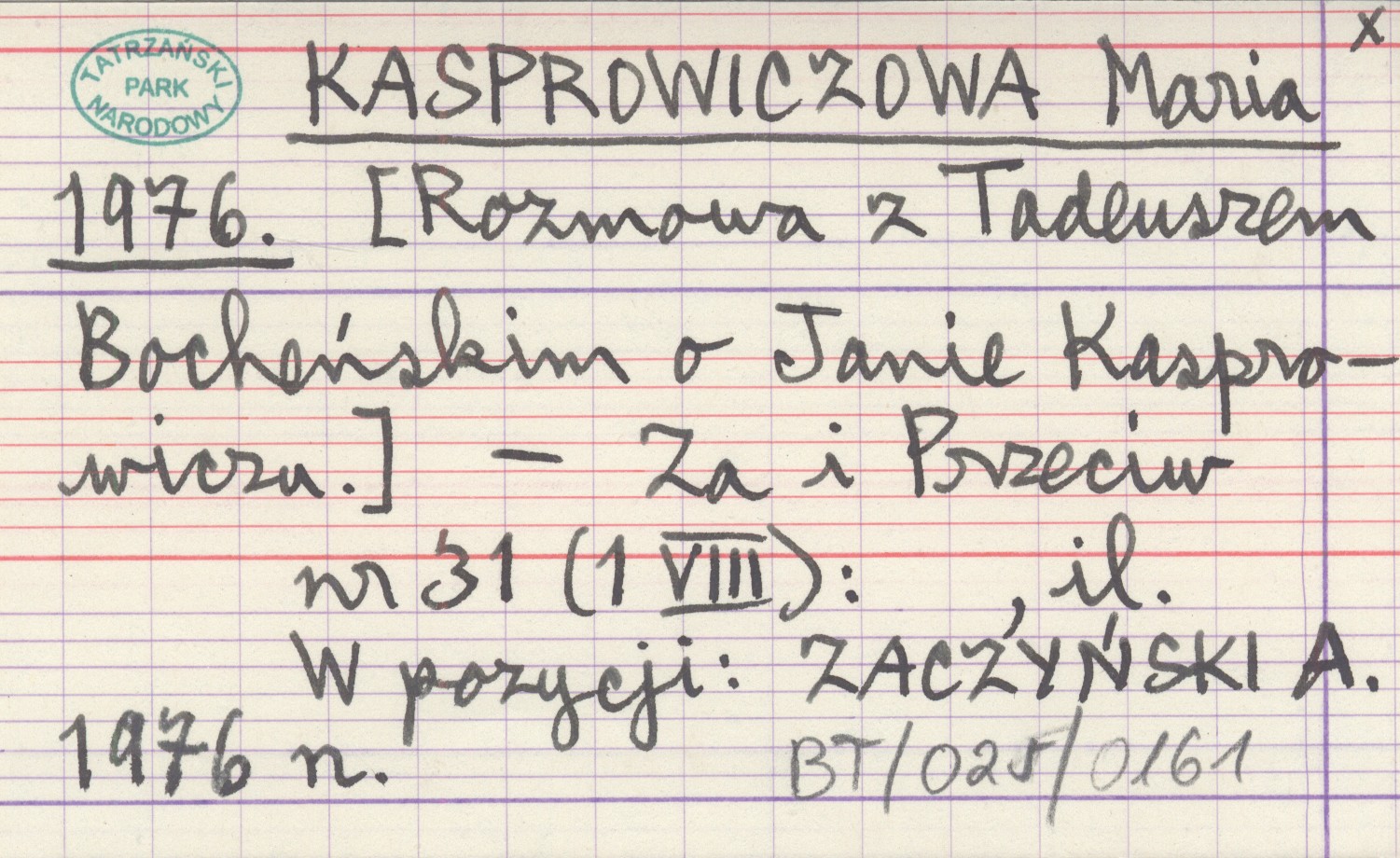 KASPROWICZOWA Maria 1976 [Rozmowa z Tadeuszem Bocheńskim o Janie Kasprowiczu].