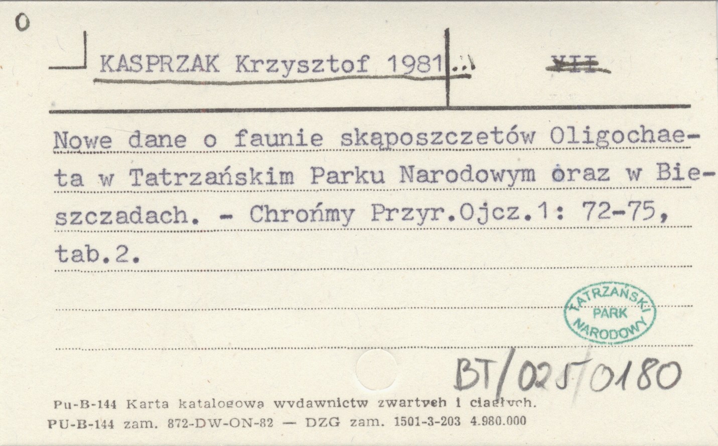 KASPRZAK Krzysztof 1981... Nowe dane o faunie skąposzczetów w Tatrzańskim Parku Narodowym oraz w Bieszczadach.