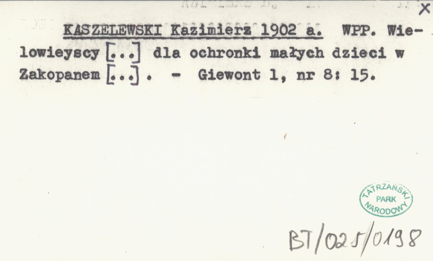 KASZELEWSKI Kazimierz 1902 a WPP. Wielowieyscy [...] dla ochronki małych dzieci w Zakopanem [...].