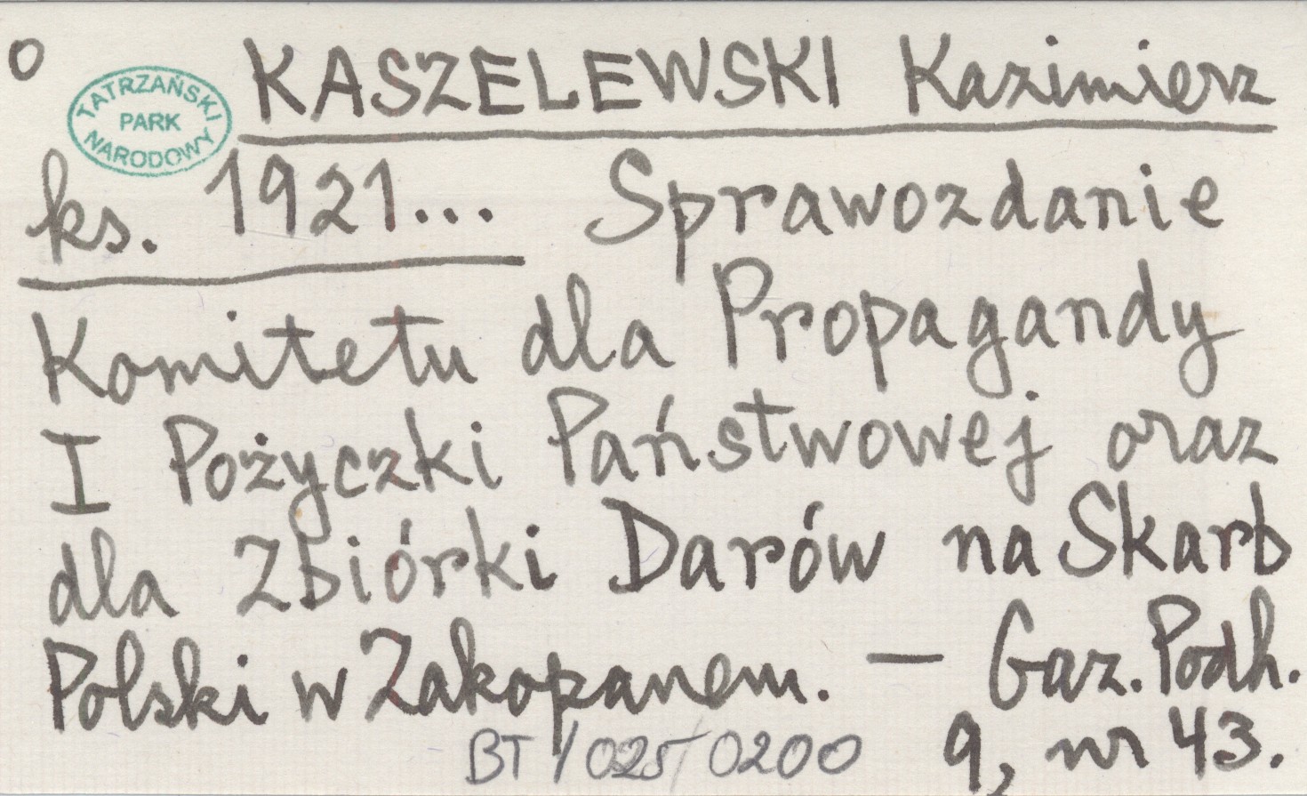 KASZELEWSKI Kazimierz ks. 1921... Sprawozdanie Komitetu dla Propagandy I Pożyczki Państwowej oraz dla Zbiórki Darów na Skarb Polski w Zakopanem.