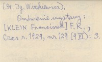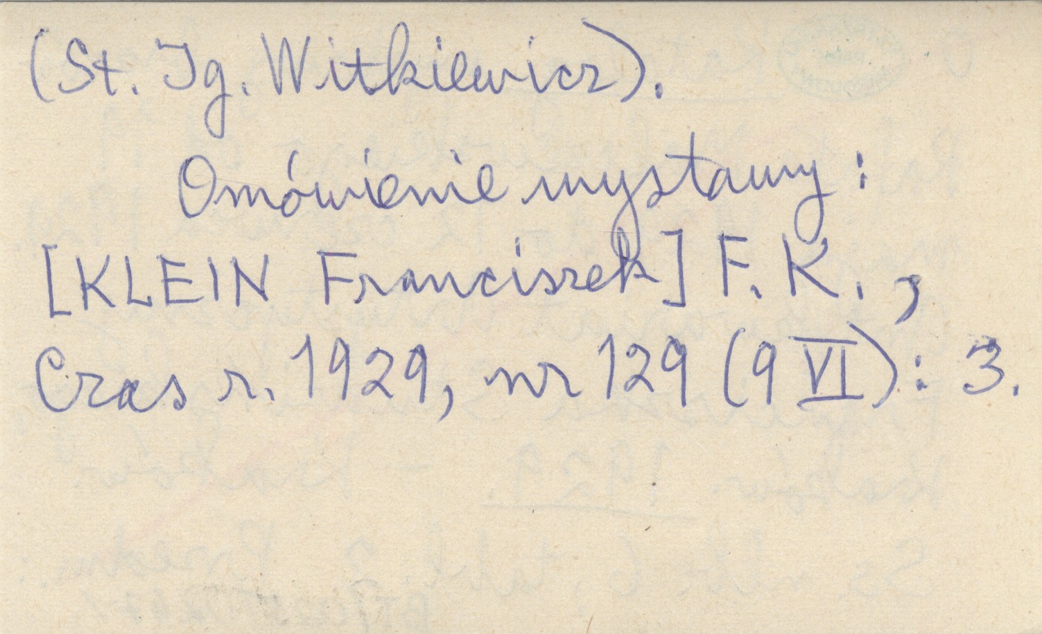 Kraków , [6] s., 2 k. Przedmowa: (St. Ig. Witkiewicz). Omówienie wystawy: [KLEIN Franciszek] F. K., Czas r. 1929, nr 129 (9 VI): 3.
