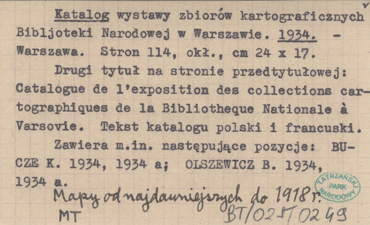 Warszawa , 114 s., okł., 24x17 cm. Mapy od najdawniejszych do 1918 r. Drugi tytuł na stronie przedtytułowej: Catalogue de l'exposition des collections cartographiques de la Bibliotheque Nationale á Varsovie. Tekst katalogu polski i francuski. Zawiera ,. in. następujące pozycje: BUCZEK K. 1934, 1934 a; OLSZEWICZ B. 1934, 1934 a. BUCZEK K. 1934, 1934 a OLSZEWICZ B. 1934, 1934 a