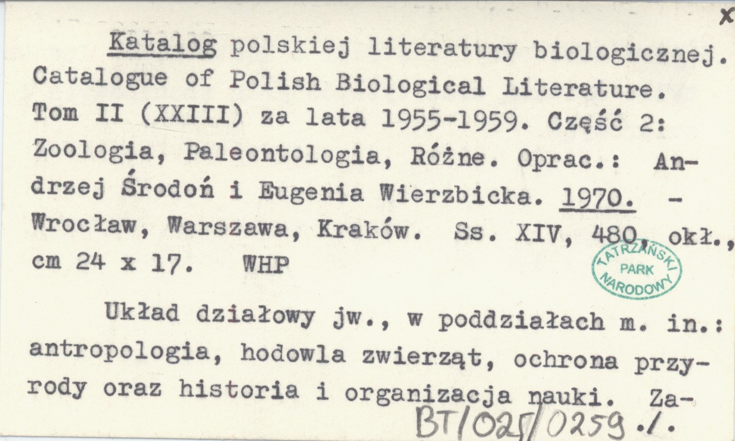 Katalog polskiej literatury biologicznej. Catalogue of Polish Biological Literature. Tom II (XXIII) za lata 1955-1959. Część 2: Zoologia, Paleontologia, Różne, Oprac.: Andrzej Srodoń i Eugenia Wierzbicka. 1970
