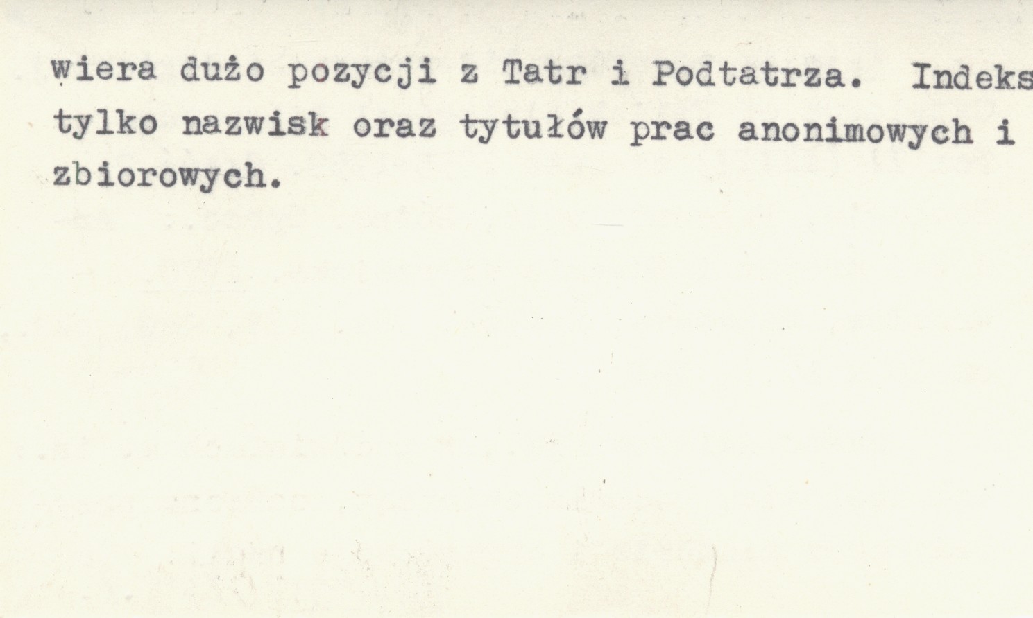 Wrocław ; Warszawa ; Kraków , XIV, 480 s., okł., 24x17 cm. Układ dziejowy jw., w podziałach m. in.: antropologia, hodowla zwierząt, ochrona przyrody oraz historia i organizacja nauki. Zawiera dużo pozycji z Tatr i Podtatrza. Indeks tylko nazwisk oraz tytułów prac anonimowych i zbiorowych.
