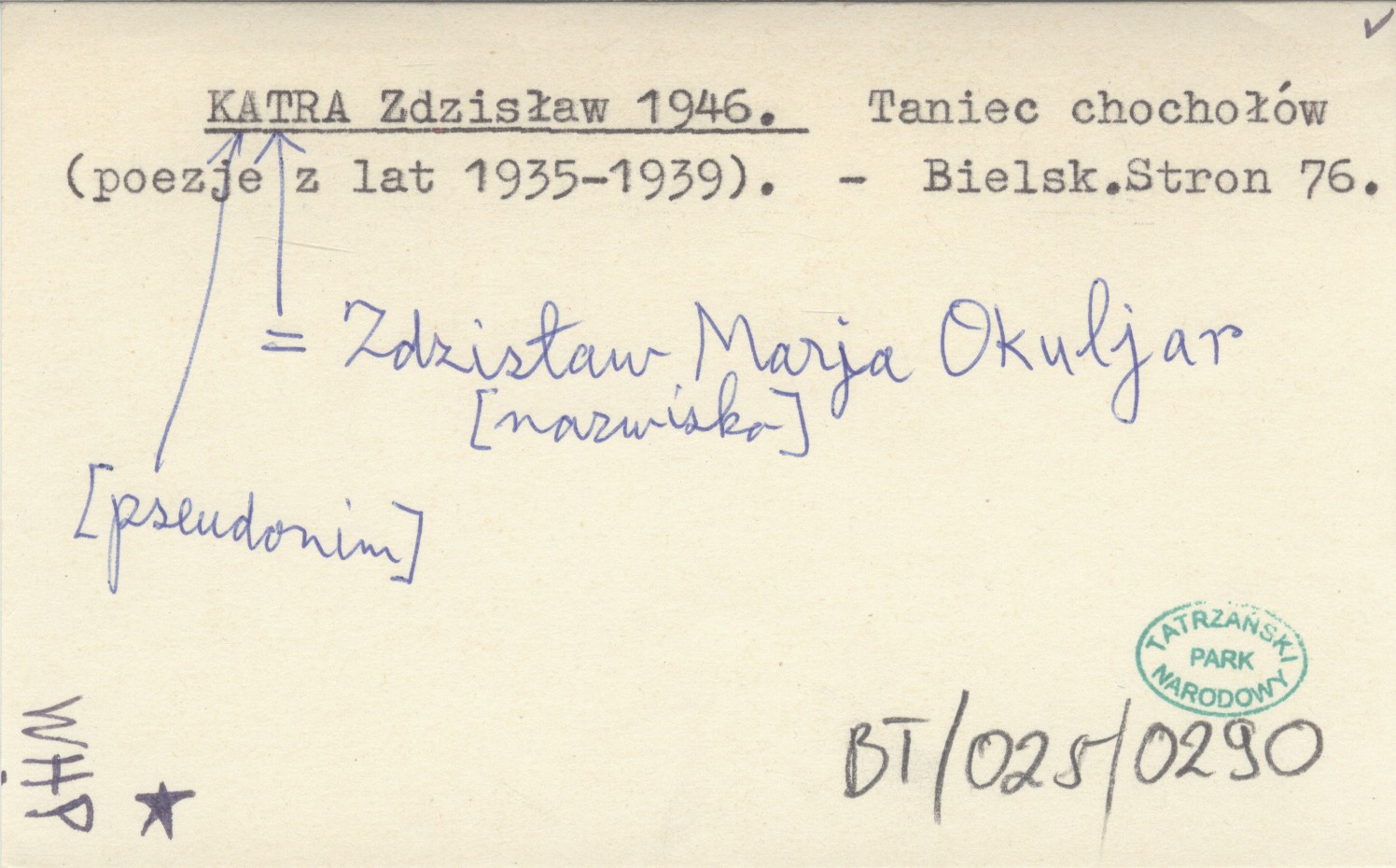 KATRA Zdzisław OKULJAR Zdzisław Marja 1946 Taniec chochołów (poezje z lat 1935-1939).