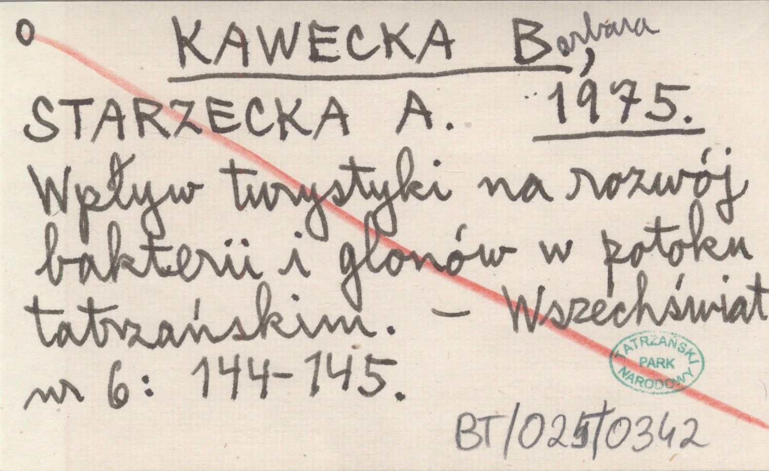 KAWECKA Barbara STARZECKA, A. ; 1975 Wpływ turystyki na rozwój bakterii i glonów w potoku tatrzańskim.