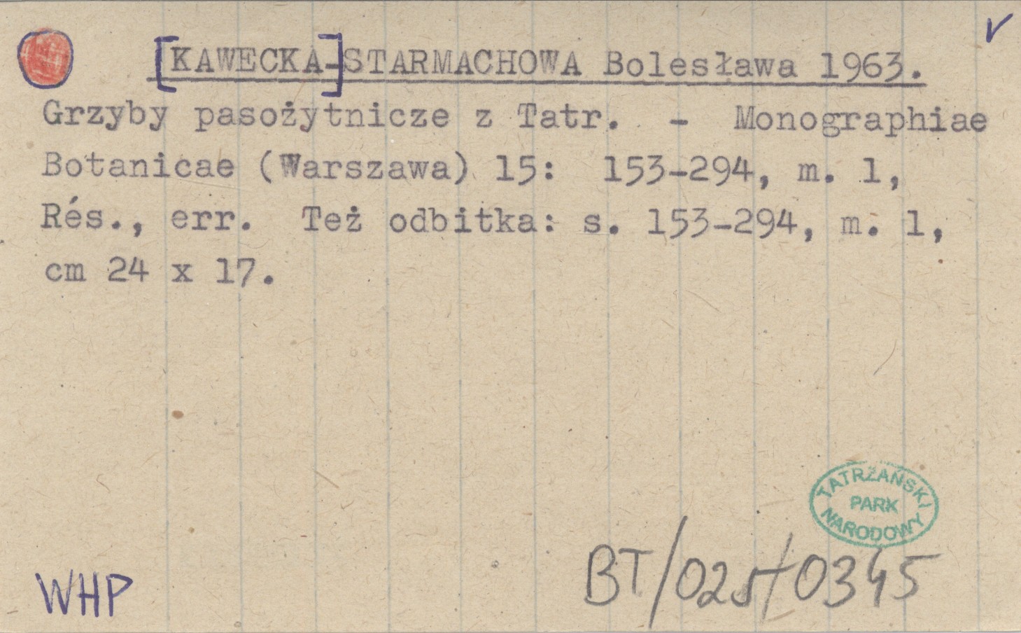 [KAWECKA-] STARMACHOWA Bolesława 1963 Grzyby pasożytnicze z Tatr.