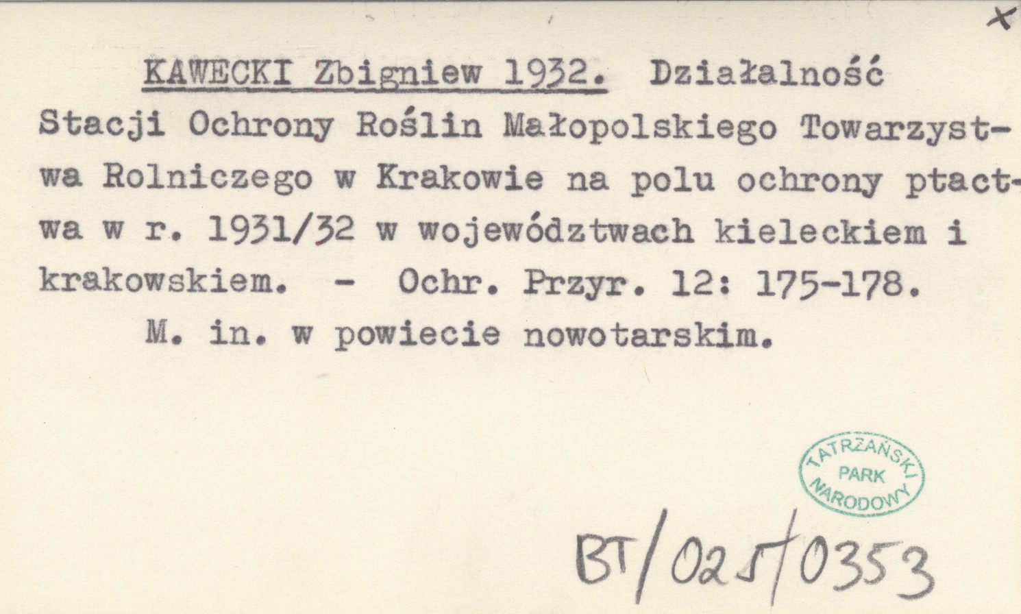 KAWECKI Zbigniew 1932 Działalność Stacji Ochrony Roślin Małopolskiego Towarzystwa Rolniczego w Krakowie na polu ochrony ptactwa w r. 1931/32 w województwach kieleckiem i krakowskiem.