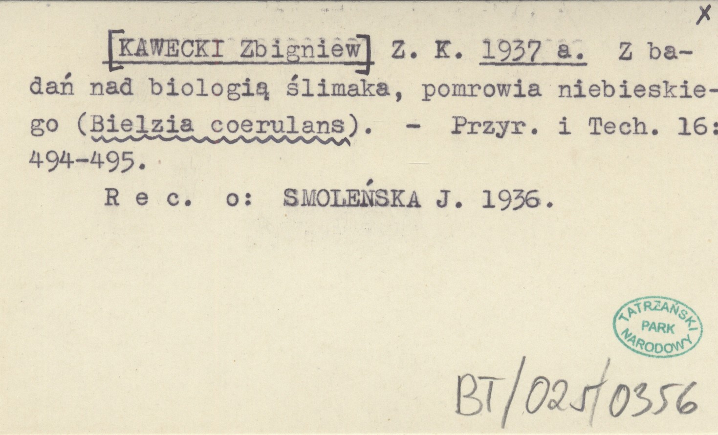 Z. K. [KAWECKI Zbigniew] 1937 a Z badań nad biologią ślimaka, pomrowia niebieskiego (Bielzia coerulans).