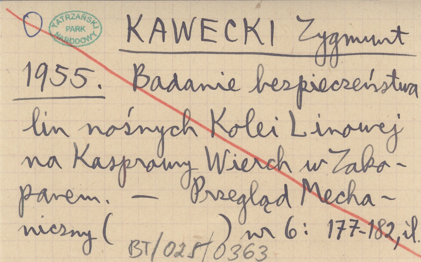 KAWECKI Zygmunt 1955 Badanie bezpieczeństwa lin nośnych Kolei Linowej na Kasprowy Wierch w Zakopanem.