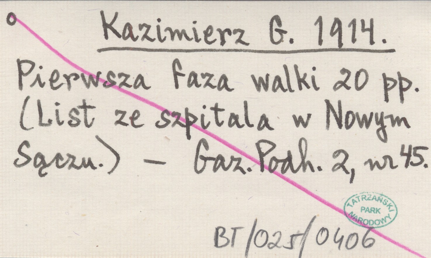 Kazimierz G. 1914 Pierwsza faza walki 20 pp. (List ze szpitala w Nowym Sączu).