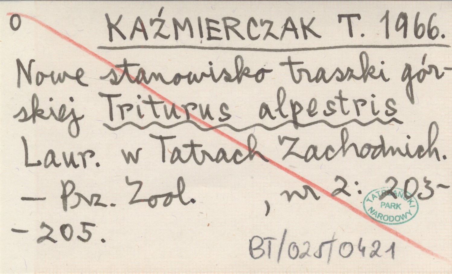 KAŹMIERCZAK T. 1966 Nowe stanowisko traszki górskiej Triturus alpestris Laur. w Tatrach Zachodnich.