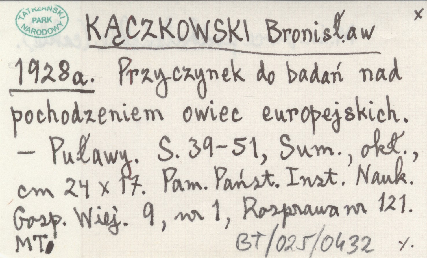 KĄCZKOWSKI Bronisław 1928 a Przyczynek do badań nad pochodzeniem owiec europejskich.