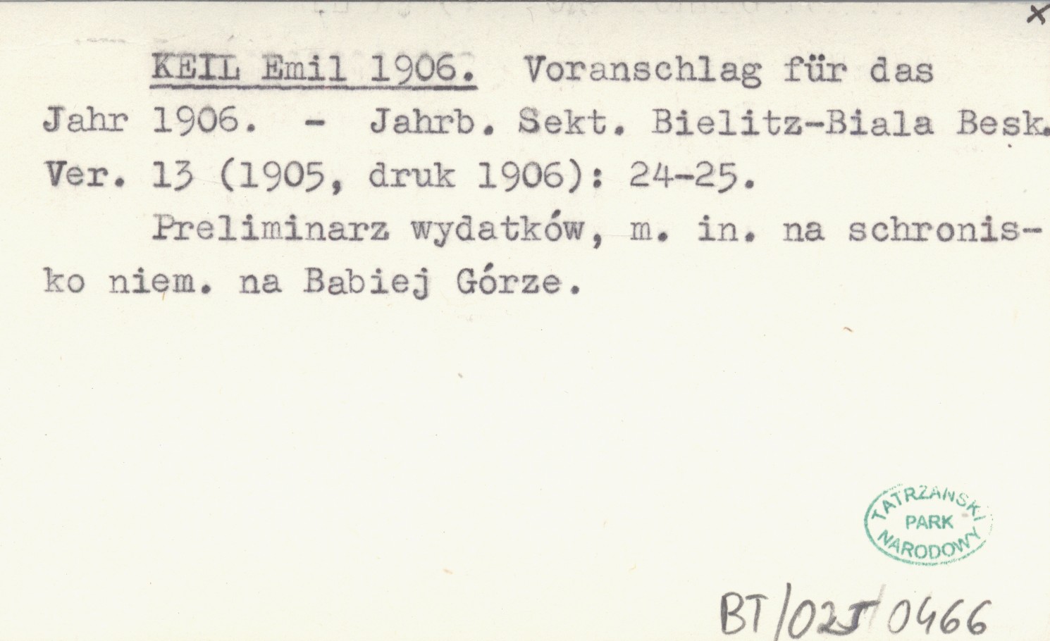 Jahresbericht der Sektion Bielitz-Biala des Beskiden-Vereines, 13 (1905, druk 1906): 24-25. Preliminarz wydatków, m. in. na schronisko niemieckie na Babiej Górze.