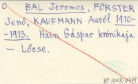 BAL Jeremos FÖRSTER, Jenő. ; KAUFMANN, Aurél. ; 1910-1913 Hain Gáspar krónikaja.