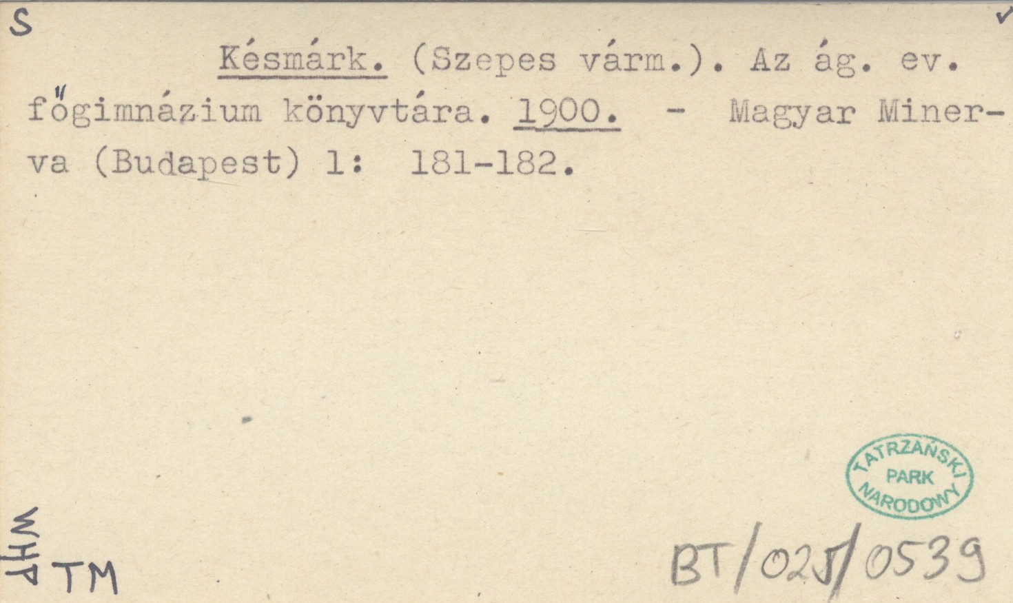 Késmárk. (Szepes várm.). Az ág. ev. főgimnázium könyvtára. 1900