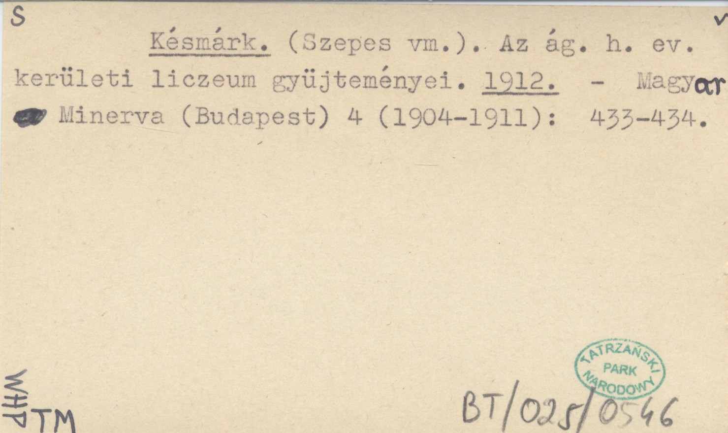 Késmárk. (Szepes vm.). Az ág. h. ev. kerületi liczeum gyüjteményei. 1912