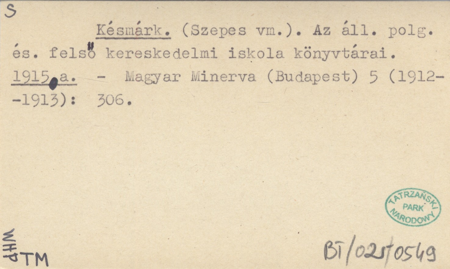 Késmárk. (Szepes vm.). Az áll. polg. és. felső kereskedelmi iskola könyvtárai. 1915 a