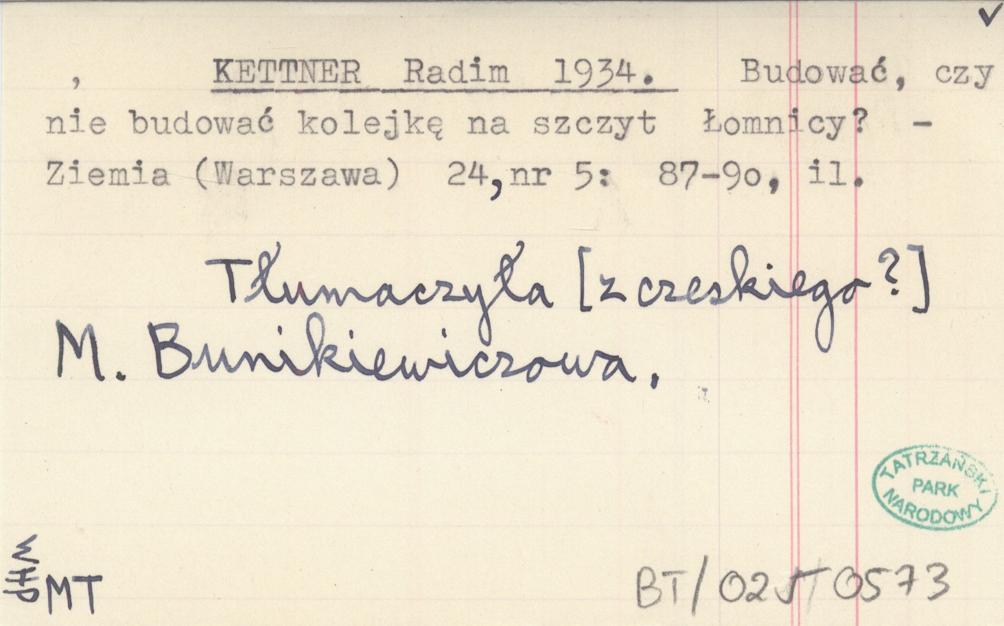 KETTNER Radim 1934 Budować, czy nie budować kolejkę na szczyt Łomnicy?
