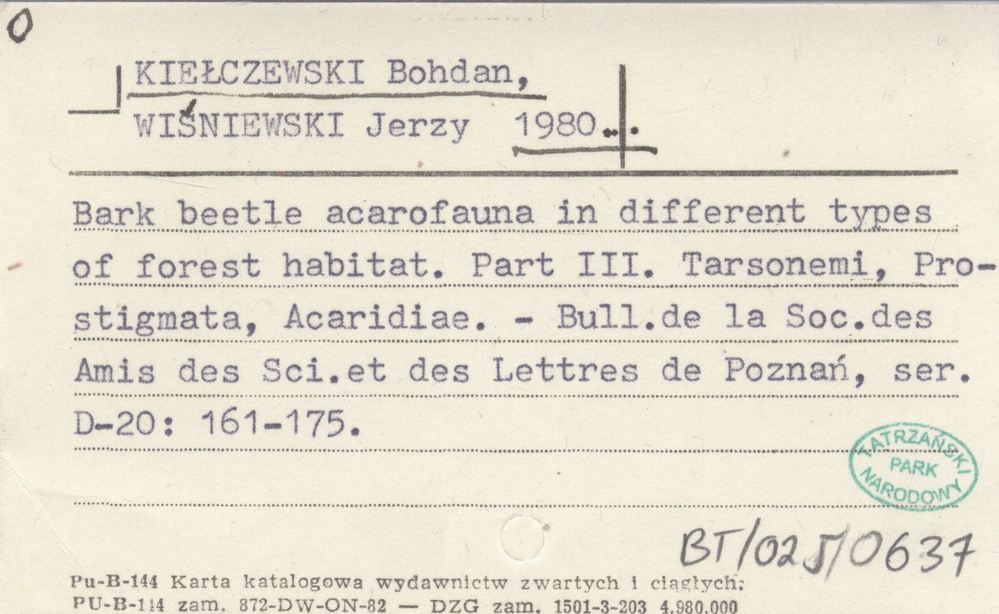 KIEŁCZEWSKI Bohdan WIŚNIEWSKI, Jerzy. ; 1980... Bark beetle acarofauna in different types of forest habitat. Part III. Tarsonemi, Prostigmata, Acaridiae.