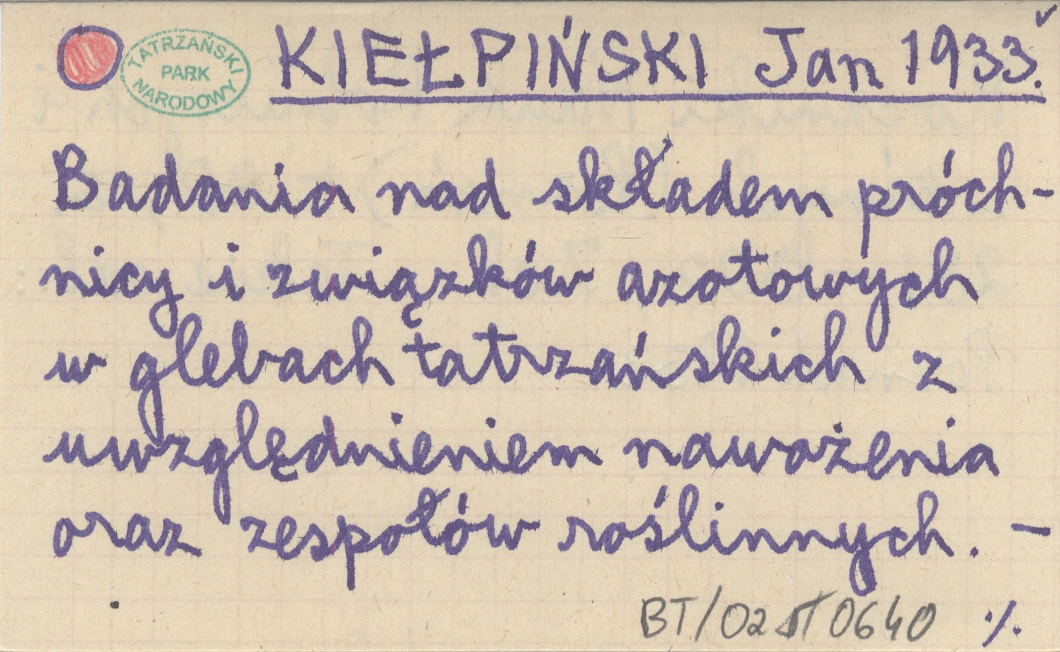 KIEŁPIŃSKI Jan 1933 Badania nad składem próchnicy i związków azotowych w glebach tatrzańskich z uwzględnieniem nawożenia oraz zespołów roślinnych.