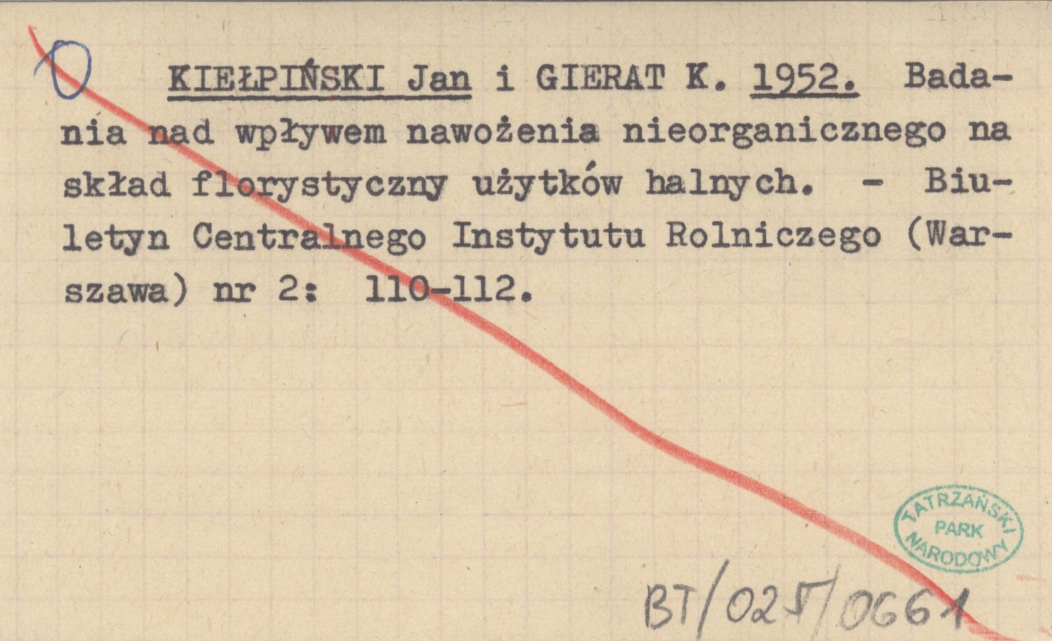 KIEŁPIŃSKI Jan GIERAT, K. ; 1952 Badania nad wpływem nawożenia nieorganicznego na skład florystyczny użytków halnych.