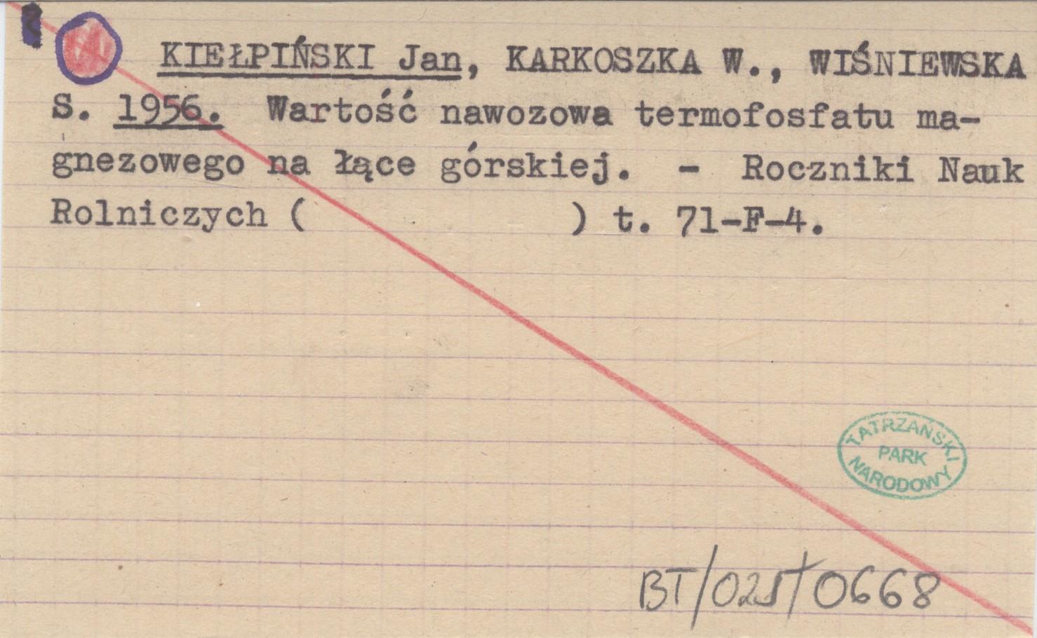 KIEŁPIŃSKI Jan KARKOSZKA, W. ; WIŚNIEWSKA, S. ; 1956 Wartość nawozowa termofosfatu magnezowego na łące górskiej.