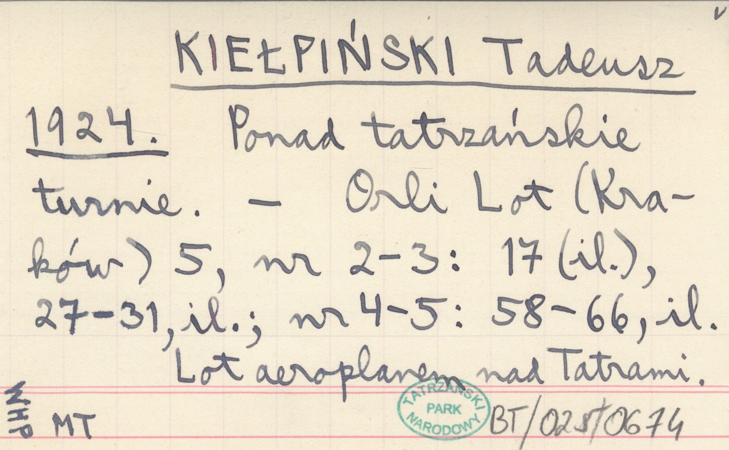 Orli Lot (Kraków) , 5, nr 2-3: 17 (il.), 27-31, il.; nr 4-5: 58-66, il. Lot aeroplanem nad Tatrami.
