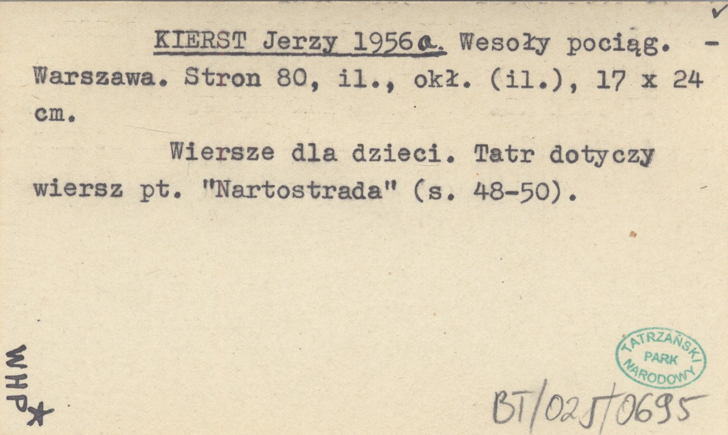 Warszawa , 80 s., il., okł. (il.), 17x24 cm. Wiersze dla dzieci. Tatr dotyczy wiersz pt. "Nartostrada" (s. 48-50).