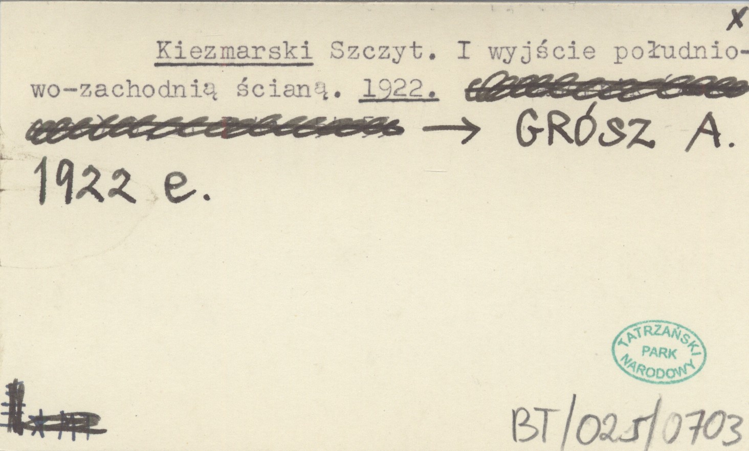 Kiezmarski Szczyt. I wyjście południowo-zachodnią ścianą. 1922